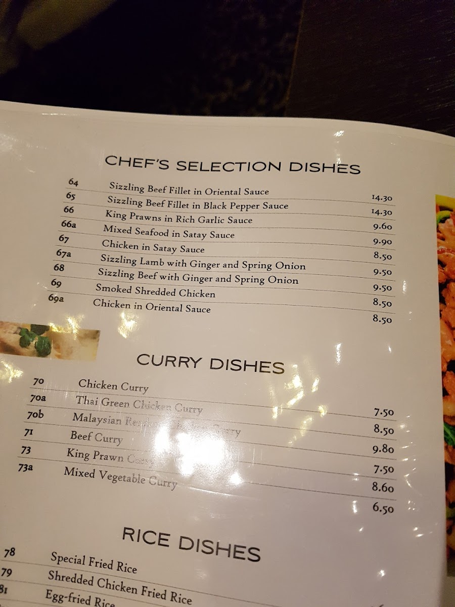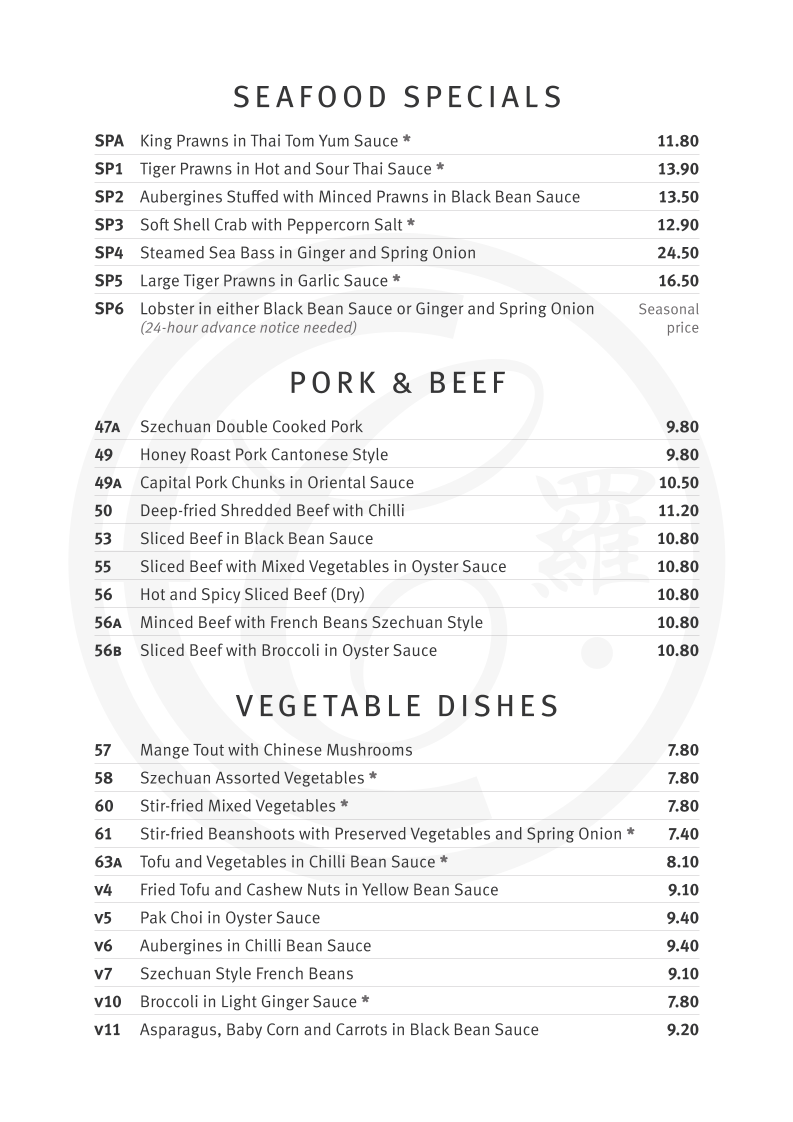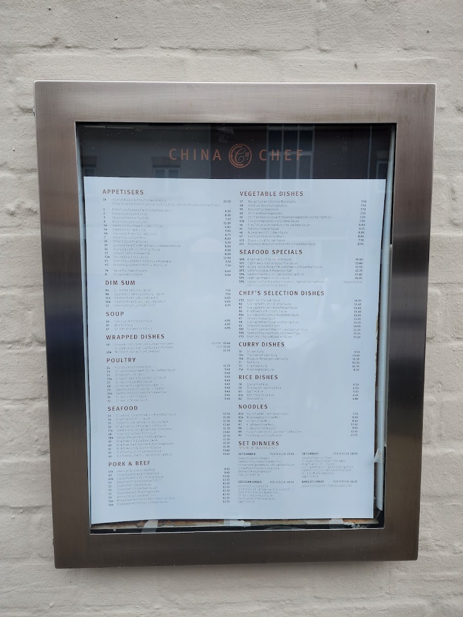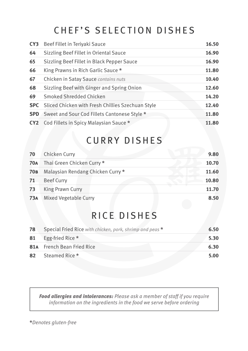The menu at China Chef in Colchester offers an extensive selection that caters to a wide range of tastes. The appetizers include enticing options like Gourmet Mixed Starters, Fried Crispy Seaweed, and Honey Roast Spare Ribs. For dim sum enthusiasts, there are delightful choices such as Grilled Pork Dumplings and Steamed Prawn Dumplings In Basket. Soup lovers can enjoy comforting bowls of Szechuan Hot And Sour Soup and Chicken And Sweetcorn Soup. The poultry section features flavorful dishes like Chicken In Lemon Sauce and Kung Po Chilli Chicken, while the pork and beef options include favorites like Szechuan Double Cooked Pork and Deep-Fried Shredded Beef With Chilli. Vegetarians will appreciate the Stir-Fried Mixed Vegetables and Braised Four Vegetables. For seafood, there's a tempting variety including King Prawns In Thai Tom Yum Sauce and Steamed Sea Bass In Ginger And Spring Onion. The chef’s selection showcases mouthwatering dishes like Beef Fillet In Teriyaki Sauce and Sizzling Lamb Cutlets In Black Bean Sauce. For those who enjoy curry, options such as Malaysian Rendang Chicken Curry and King Prawn Curry are available. To complement your meal, China Chef also offers Egg-Fried Rice, Plain Chow Mein, and a variety of noodle dishes like Singapore Fried Noodles. Whether you're in the mood for something spicy, savory, or sweet, the diverse menu promises a satisfying experience for every palate.