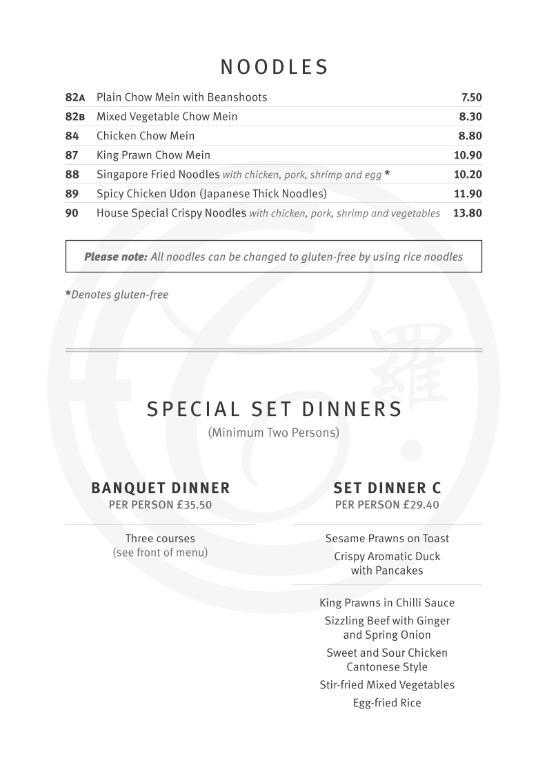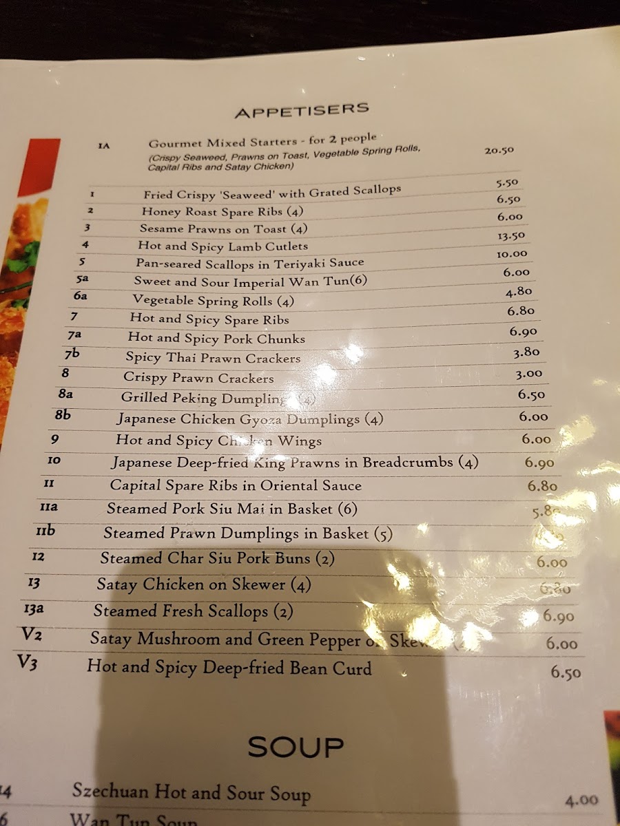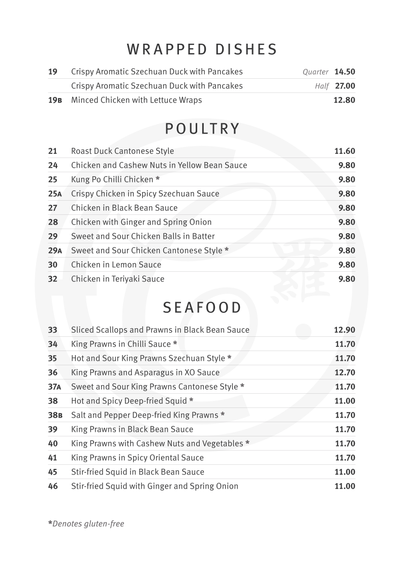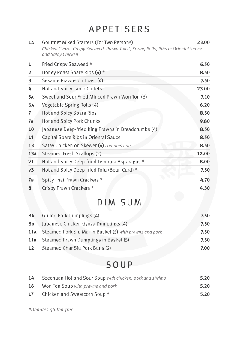 The menu at China Chef in Colchester offers an extensive selection that caters to a wide range of tastes. The appetizers include enticing options like Gourmet Mixed Starters, Fried Crispy Seaweed, and Honey Roast Spare Ribs. For dim sum enthusiasts, there are delightful choices such as Grilled Pork Dumplings and Steamed Prawn Dumplings In Basket. Soup lovers can enjoy comforting bowls of Szechuan Hot And Sour Soup and Chicken And Sweetcorn Soup. The poultry section features flavorful dishes like Chicken In Lemon Sauce and Kung Po Chilli Chicken, while the pork and beef options include favorites like Szechuan Double Cooked Pork and Deep-Fried Shredded Beef With Chilli. Vegetarians will appreciate the Stir-Fried Mixed Vegetables and Braised Four Vegetables. For seafood, there's a tempting variety including King Prawns In Thai Tom Yum Sauce and Steamed Sea Bass In Ginger And Spring Onion. The chef’s selection showcases mouthwatering dishes like Beef Fillet In Teriyaki Sauce and Sizzling Lamb Cutlets In Black Bean Sauce. For those who enjoy curry, options such as Malaysian Rendang Chicken Curry and King Prawn Curry are available. To complement your meal, China Chef also offers Egg-Fried Rice, Plain Chow Mein, and a variety of noodle dishes like Singapore Fried Noodles. Whether you're in the mood for something spicy, savory, or sweet, the diverse menu promises a satisfying experience for every palate.